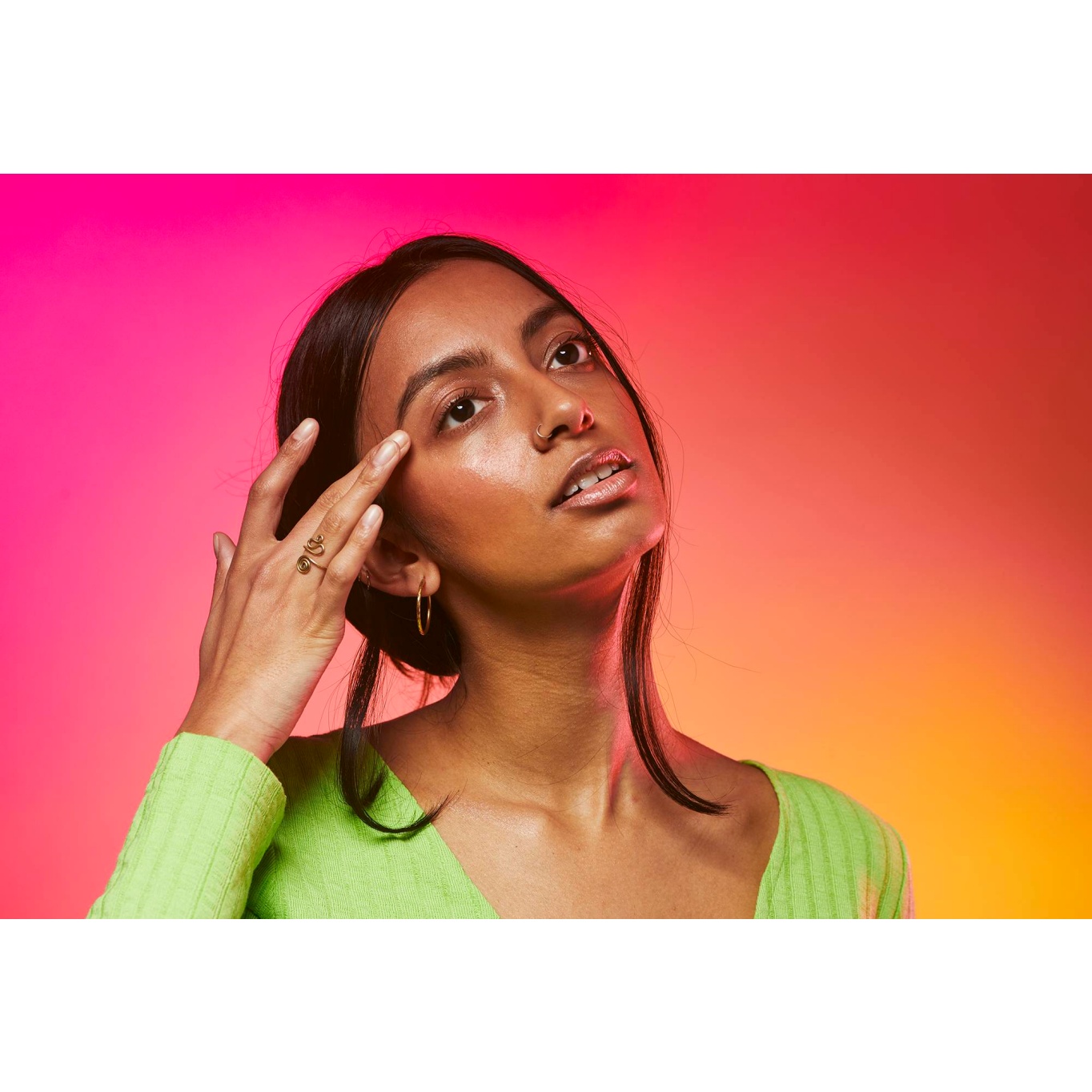 Use fingers to apply to your brow bone, inner corners of the eyes and along your Cupid’s bow for a chic but subtle shimmer in the light. For stand-out metallic shine layer up onto your cheekbones and down the bridge of your nose, by applying directly onto the skin and blending with a Lush makeup brush.
