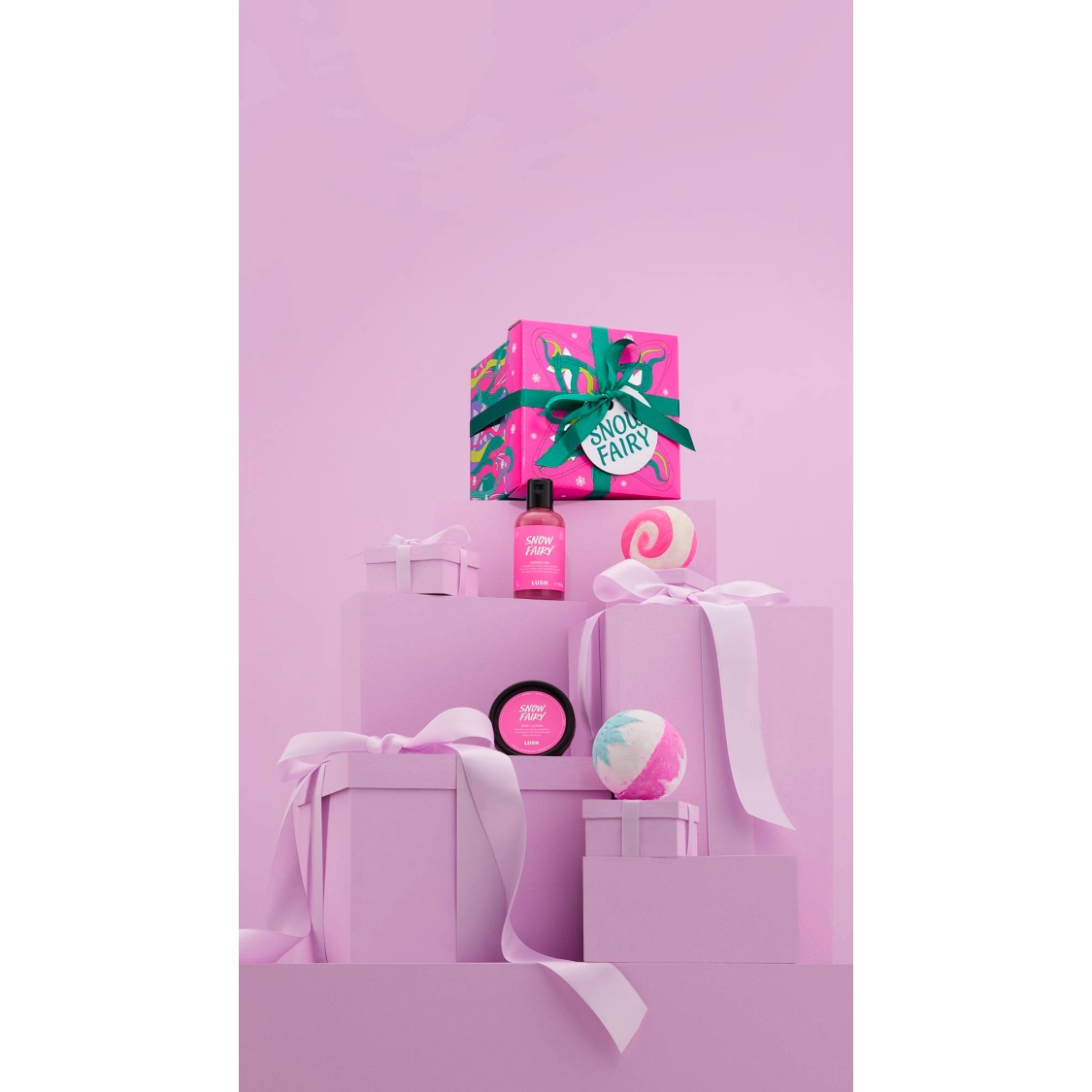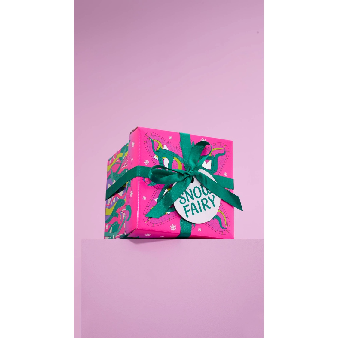 Set in a forest glade, Lush Gift Designer, Kate Ellison, creates a portal to the Snow Fairy world, drawing inspiration from fairy doors, she says, “The colour pallet uses pinks and purples and adds in a bit of foiled sparkle for the shimmering fairy wings. Because anyone can be a Snow Fairy it was important to me that the fairies are symbolised by wings and their bodies hidden away among the flowers, so you can imagine yourself traveling through the gateway, whoever you are.”