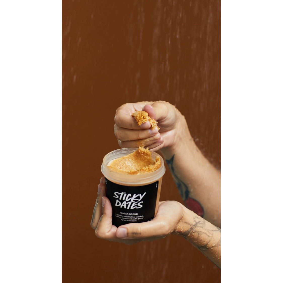 This scrub exfoliates, moisturises, and scents skin with our bestselling rich, vanilla-caramel fragrance. For the full routine, we recommend lathering up with Sticky Dates shower gel first. Once you’ve rinsed, gather a handful of this scrub to sweep over your body. Golden caster sugar exfoliates to reveal glowing skin, while Fair Trade organic cocoa butter and date syrup hydrate, leaving you feeling soft and smelling like a treat.